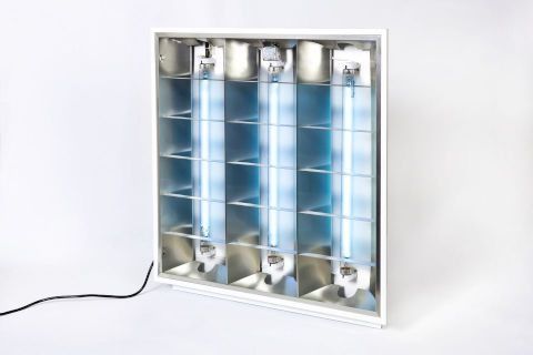 This UV ceiling lamp made up of 3 Philips T8 UV-C tubes has a standard size and can be installed on the ceiling.